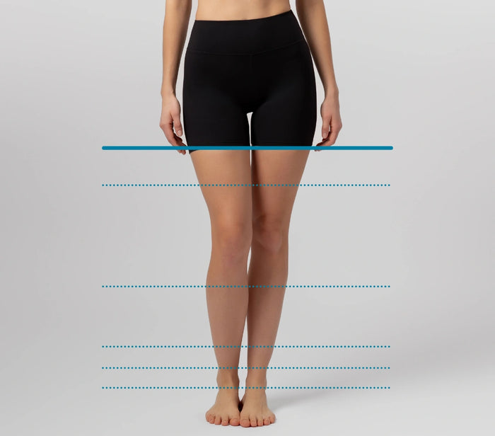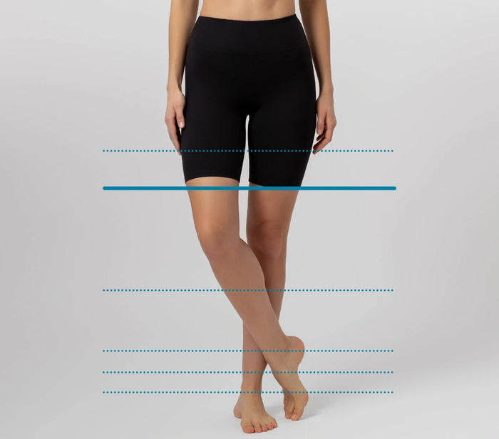 Modelka má na sebe krátke legíny (šortky) vo veľkosti MEDIUM s vnútorným švom 12 cm.